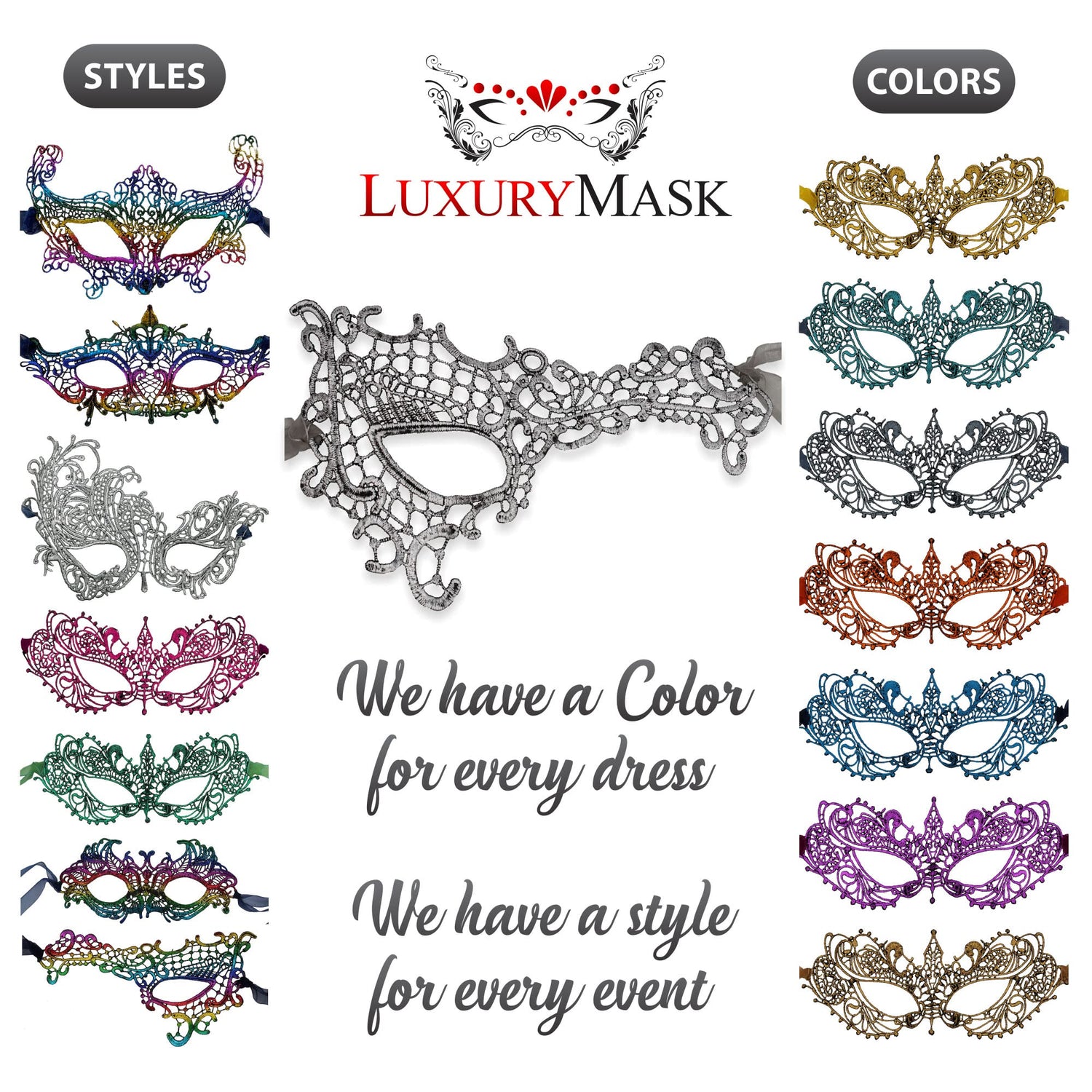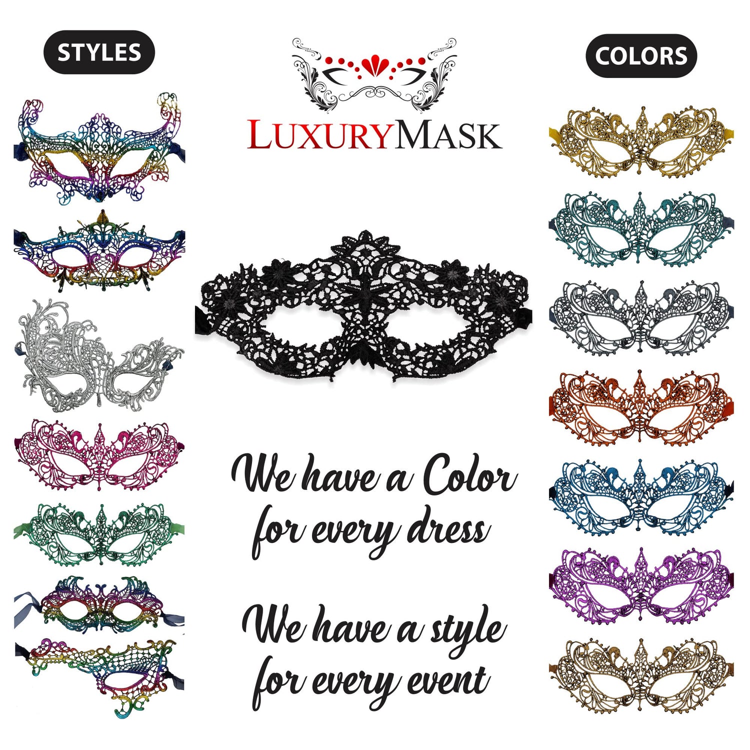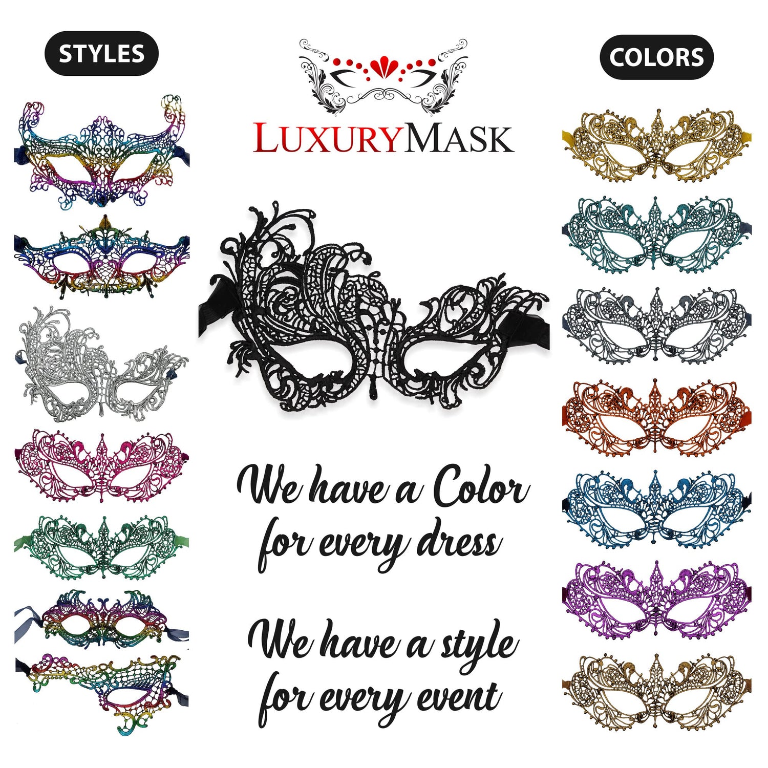 - Wide Range of Colors and Styles: We offer these masks in a wide range of colors and styles to suit any taste or occasion. In addition to classic colors like Black, Silver, Red, Gold, Purple and Green we also have unique styles such as Classic Ana Masks, Phantom of the Opera, Crown and Floral, and Swan Masks. With so many options available, you're sure to find the perfect mask to match your outfit and make a statement
